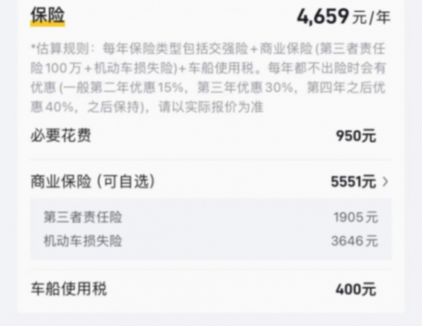 商业保险:5551元(其中第三方责任险按100万元的赔付计算,费用为1905元、车辆损失险3646元,赔付额度可以根据自己的需求选择。)