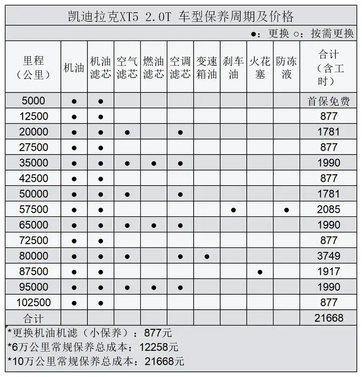 根据保养手册,车辆的首保里程为5000km,建议保养间隔为7500公里或6个月(以先到者为准)。若使用全合成机油,保养里程可延长至1万公里或12个月。6万公里内的保养项目及费用大致包括:机油、机油滤清器、空气滤清器、空调滤清器、刹车油、火花塞、防冻液、燃油滤清器及一些常规检查,预计费用约为12258元。相较于其他豪华中型suv,凯迪拉克xt5的保养费用还是相对亲民的,且保养周期较长。