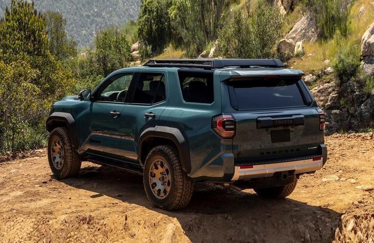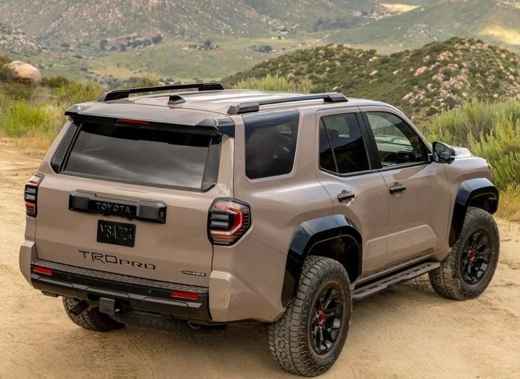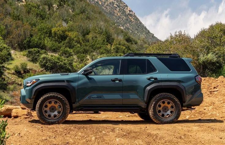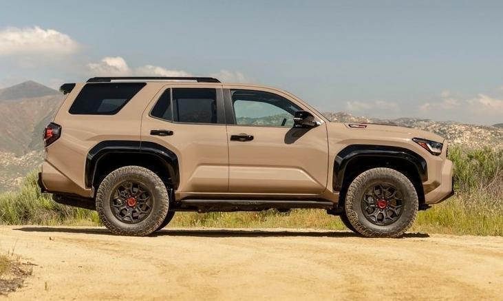 从车身侧面来看,全新4runner保留了经典的硬派车身线条,车顶采用粗壮的行李架设计,突出了轮拱和车门折线设计的立体感。车辆的离地间隙较高,搭配了高扁平比轮胎,同时车辆提供at全地形轮胎可供选择,越野性能相对好于标准版。和老款车型进行对比,新车的轴距增加61毫米,并且车长增加119毫米,接近角和离去角各自为32度、24度。