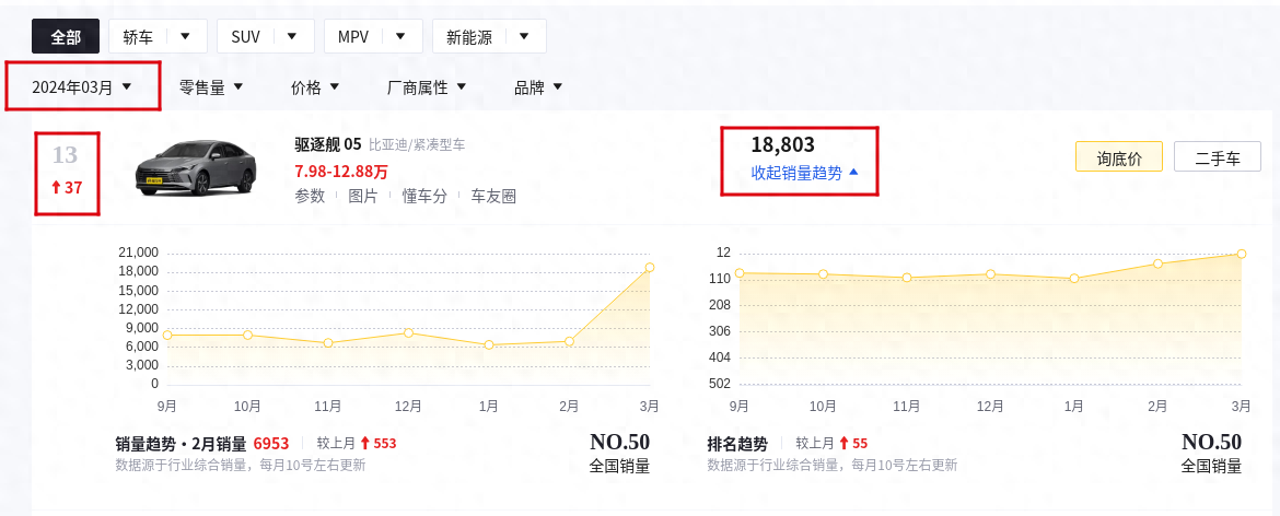 随着新能源汽车的快速发展,越来越多的消费者在购车时都将购车目光投至到新能源汽车身上,其较低的用车成本也着实吸引了不少的消费者,毕竟现阶段居高不下的油价,也让很多朋友在购车时非常重视用车成本。今天我们要聊的这款车则是比亚迪旗下的比亚迪海洋网旗下的一款车型比亚迪驱逐舰05,在懂车帝发布的3月份汽车销量排行榜中,驱逐舰05凭借18803辆的销售成绩拿下了3月份销量排行榜第13名,相比上个月更是直接上升了37个名次。可见这款车整体的表现还是非常的亮眼。