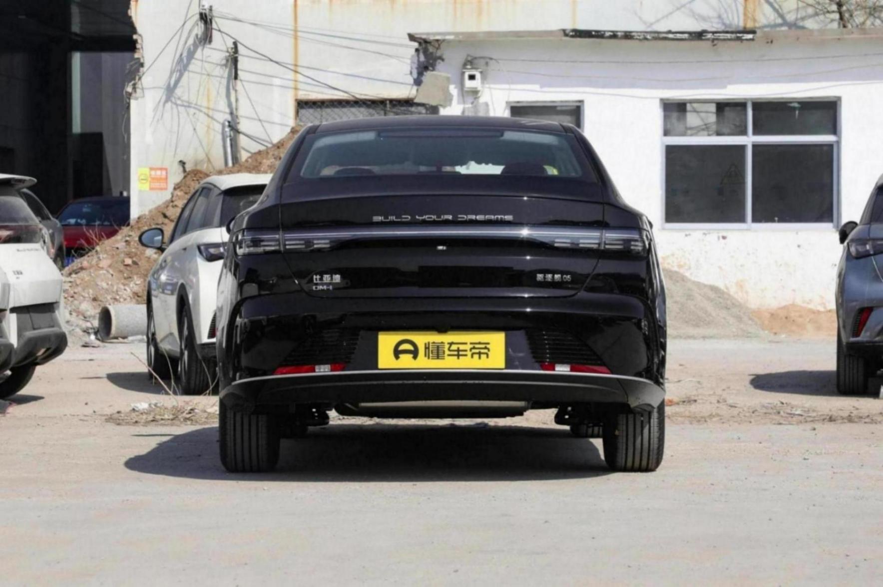 车尾部分,车尾中间位置使用了当下较为流行的贯穿式后尾灯,与前脸相呼应,值得一提的是灯罩并没有使用常用的红色设计,而是做了简约朴素风格的黑白色。两侧的后导风口与前脸处保持统一,同时在尾灯中间位置,设计了比亚迪 build your dream字母标识。