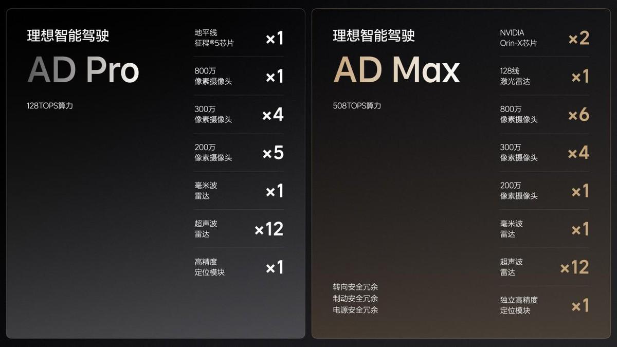 在智能驾驶方面,理想l6提供ad pro和ad max两种配置。理想l6 pro标配ad pro,配备地平线征程5智能驾驶芯片,具备128tops算力,感知硬件匹配10颗摄像头和1颗前向毫米波雷达。理想l6 max标配理想ad max ,配备2颗nvidia orin-x智能驾驶芯片,508tops算力,感知硬件匹配1颗128线高分辨率激光雷达和环绕车身的11颗摄像头,实现视觉和激光雷达双重冗余。其中,ad max还有三项更新:收费站自主通行、lcc 代驾指挥功能、城市noa逐步开放到全国所有路段。