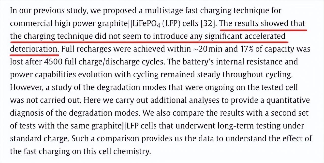 根据国外研究,在使用快充后,磷酸铁锂充满时间减小到了 20 分钟,而经过 4500 次循环后,容量仅损失了 17% ,和正常充电损耗基本相当,所以咱们大可不必担心这件事。
