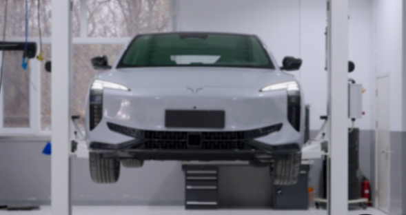 至于底盘悬挂和电机,我们直接将红旗eh7举起来看。红旗eh7举起来后可以清晰地看到,它的底盘平整度很出色,这样的设计,能够带来更好的风阻系数,对于提升车辆续航有一定的帮助。同时,平整的底盘设计,对于降低噪音,提升整车nvh也有实际意义。