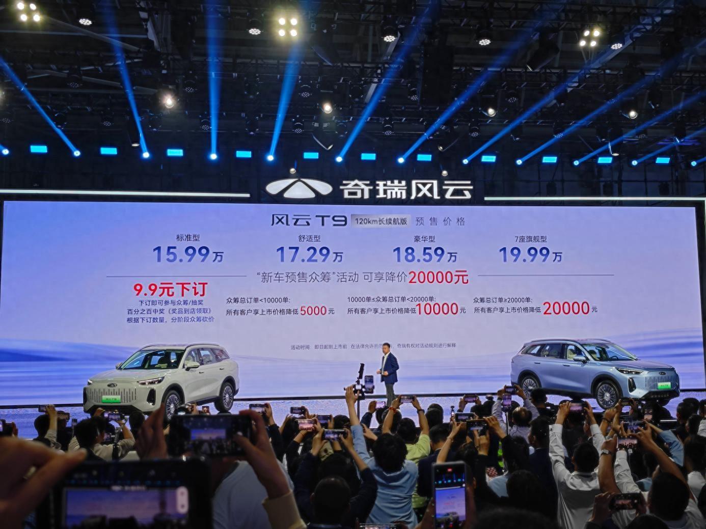 4月18日,奇瑞风云t9正式开启预售,预售价格为15.99-19.99万元,不过现在有9.9元下订参与众筹的活动,除了可以抽奖之外,如果众筹订单超过20000单,那上市时各车型价格将会再降2万元,相当于车系售价为13.99-17.99万元,性价比一下就凸显出来了!
