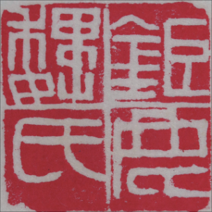 赵之谦刻《钜鹿魏氏》在篆法上,四字均加入了赵氏对诏版的理解,是他从诏版中悟出的气息。在线条上劲健爽利;在章法上,将四字全部上提,“氏”字留红更加醒目,同时又将“钜”字下坠,“钜”字上部留红与“氏”字留红相呼应,更有层次感。十字界格是此印的亮点,几乎每个字都与十字界格发生联系。此外,界格线条与纵横线条的峭爽劲健彰显了刻刀克服石面阻力带来的刀刻质感,有刀有石,金石味十足,而“氏”字与“鹿”字下部曲笔的收放笔又凸显笔情墨意,有笔有墨,书卷味浓厚。