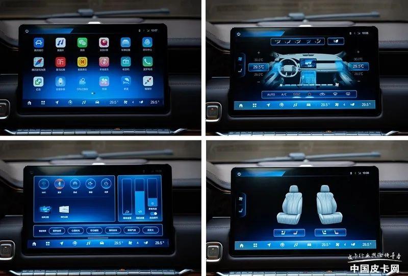 在舒适性方面,火星皮卡将车内环境和功能向豪华、科技、品质感方向升级。氛围灯带营造豪华科技感;仪表板、座椅和门板设计型面饱满,层次丰富;采用大面积皮质包覆,带来豪华的视觉感受;搭载14.6英寸中控屏 12.3英寸数字液晶仪表的智慧双屏;中控台支持手机无线充电,摆脱线束限制;后排27°的靠背与suv一致,是乘坐人员的黄金倾斜角度,头部腿部空间更为宽适;10向电动调节座椅,具备三档记忆与通风加热功能;拥有超大全景天窗,采光与通风性更好,带来更加开阔的视野。