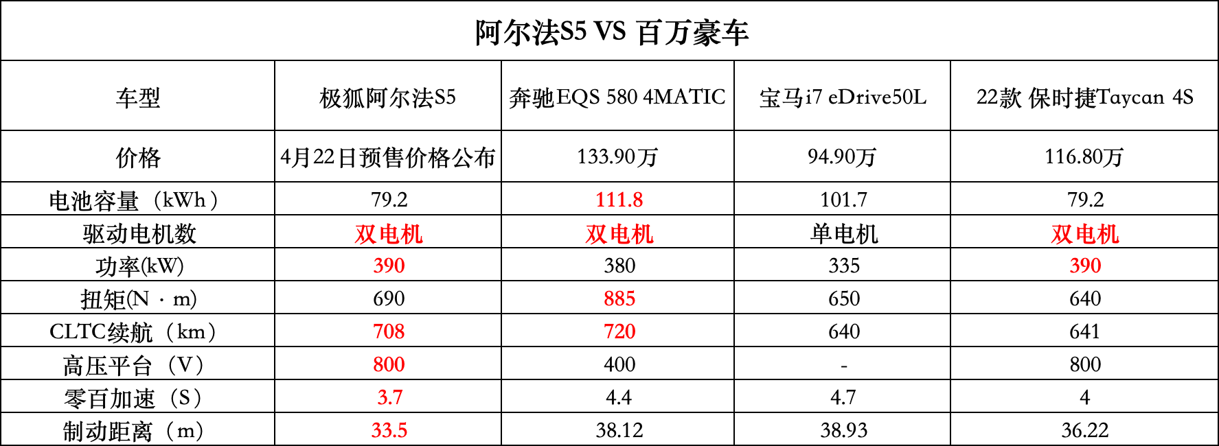 在最核心的动力技术上,应该是阿尔法s5最硬气的敲门砖,新车提供了单电机两驱和双电机四驱可选,四驱版车型的最大功率为390kw,最大扭矩为690nm,百公里加速时间仅需3.7秒,cltc续航为650公里,长续航版本可达708公里。与保时捷taycan、宝马i7、奔驰eqs相比较,阿尔法s5的动力组合已达到“百万级”水平。