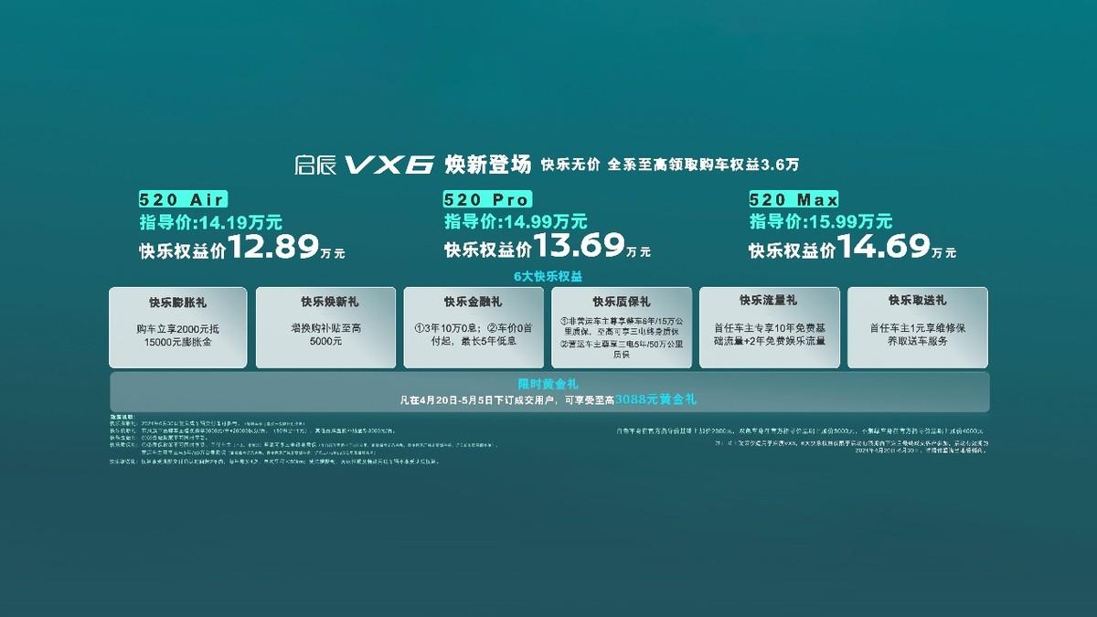 不焦绿的启辰vx6,当然也会有一个不焦虑的价格。焕新登场的启辰vx6,顶配版本520 max版,指导价为15.99万元,快乐权益价为14.69万元。启辰vx6 520 pro版指导价为14.99万元,快乐权益价13.69万元。启辰vx6 520 air 版指导价为14.19万元,快乐权益价12.89万元。启辰vx6给客户带来了6重大礼包,全系至高领取购车权益3.6万!