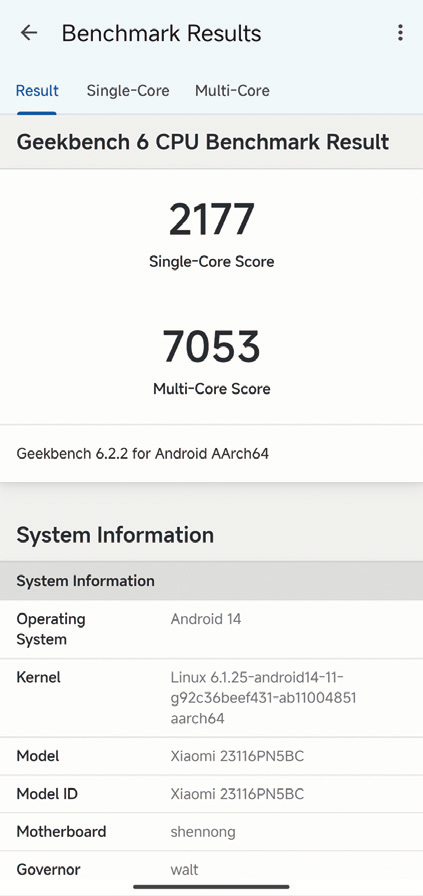▲geekbench 6中小米14 pro单核成绩为2177分,双核成绩为7053分。
