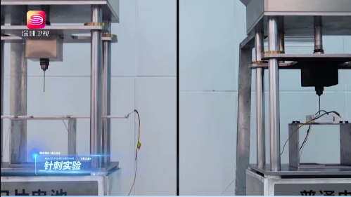 当看到普通电池被刺穿后瞬间爆炸,而比亚迪刀片电池被刺穿后持续稳定的巨大反差时,非常震撼!