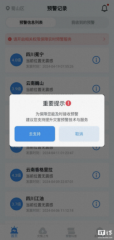 4 月 23 日消息,“地震预警”app 是“四川成都高新减灾研究所”推出的一款“接入苹果 ios 紧急预警系统”的灾害资讯速报应用,据it之家小伙伴投稿,这款应用安卓版本近日更新 9.0.0 版本,主要加入了预警功能订阅,订阅价格为 10 元 / 年。