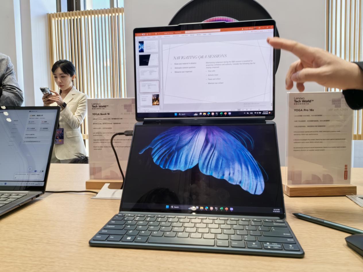 4月18日,在上海举行的第十届联想创新科技大会tech world上,联想集团董事长兼ceo杨元庆手中举着yoga book 9i说:“联想正式发布中国市场真正意义上的ai pc产品。”