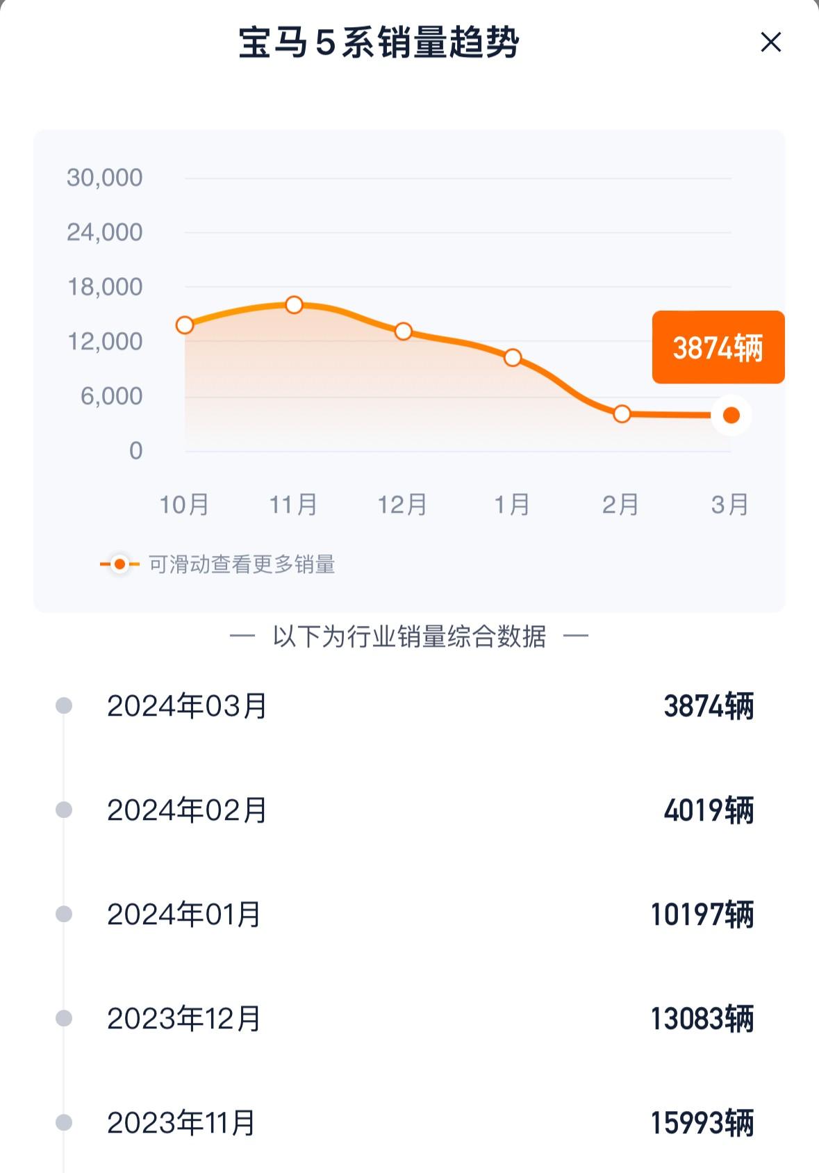 不过随着换代5系上市,好戏才真的开场,新车1月份上市,本以为2月份会来个开门红,结果等来的是4000出头的销量,连老款退市的一半都不到。什么?你说春节前集中释放了销量?那好吧,我们接着看3月的数据—3874辆,还不如2月份,够不够拉胯?