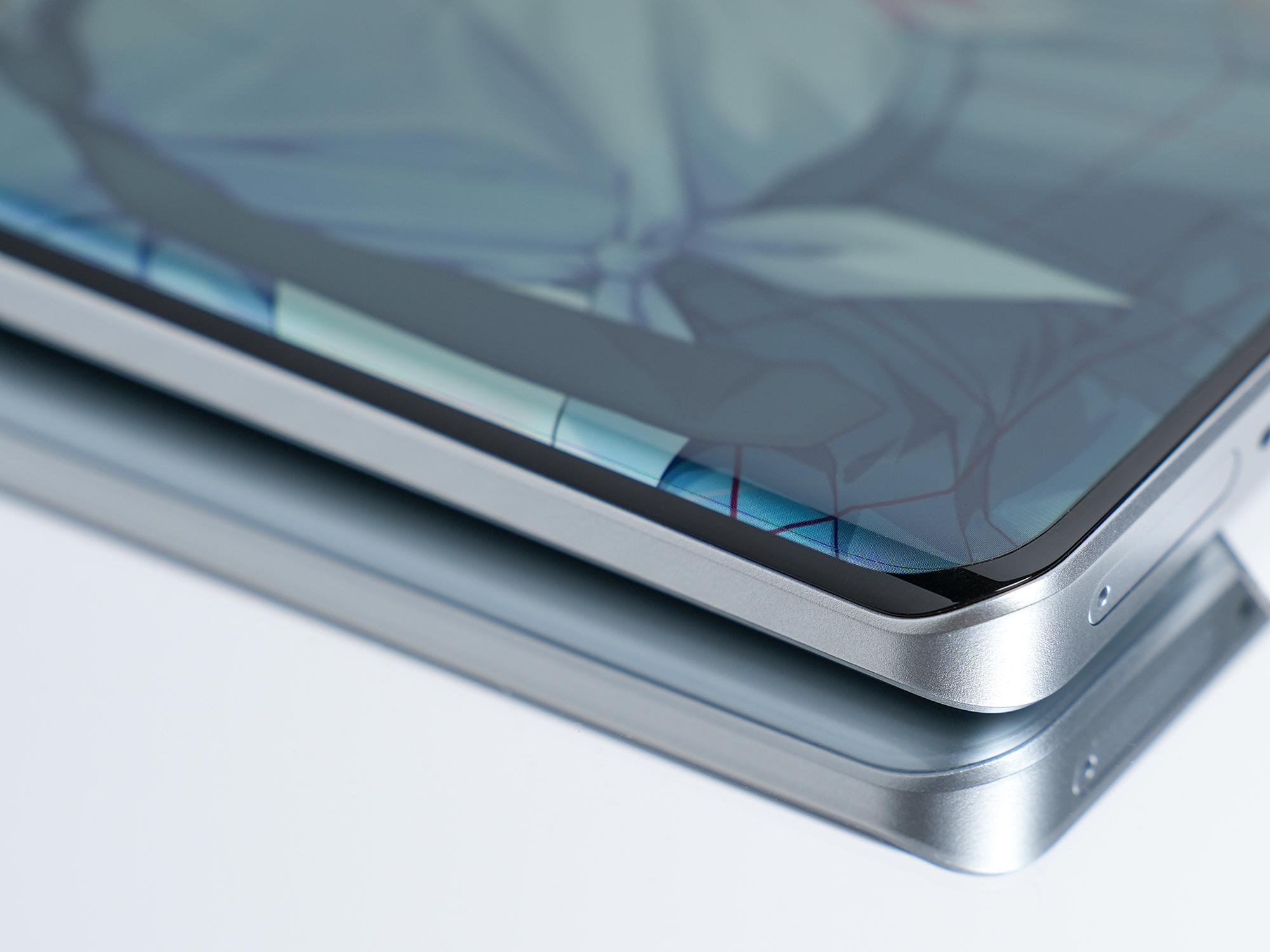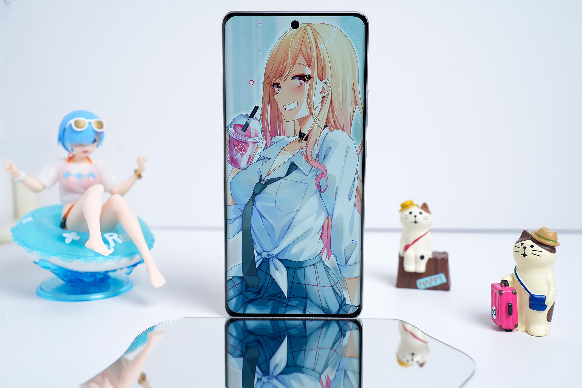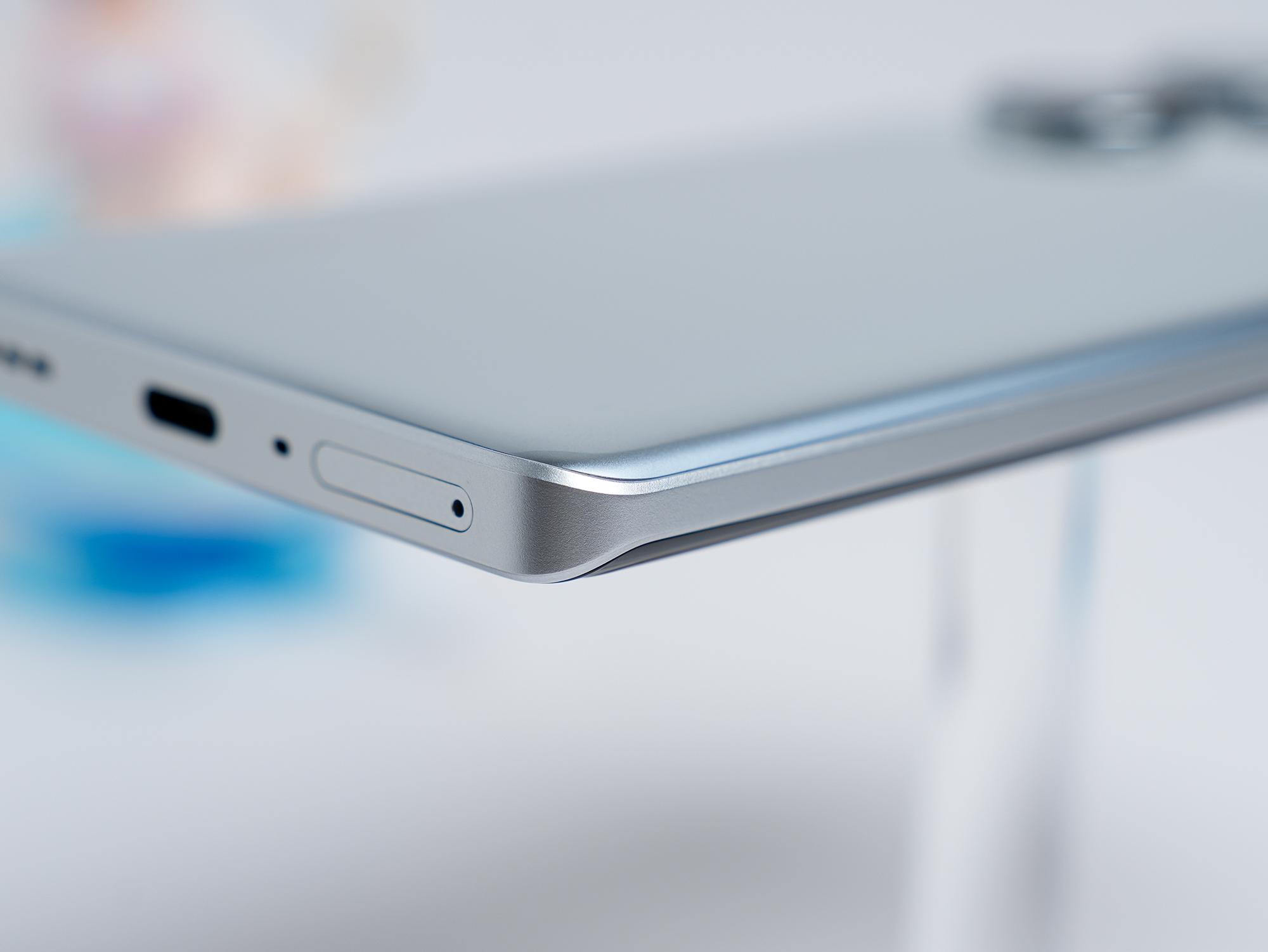 我这台手机配色为gt neo6 se系列主打的「流银骑士」配色,科技感非常强,正面采用是一块1.5k分辨率,6.78英寸微曲面屏,手指触控操作滑过边缘时很舒适;居中挖孔前置摄像头,配合窄下巴和窄边框,亮屏后屏占比很高,整体的视觉观感挺震撼。