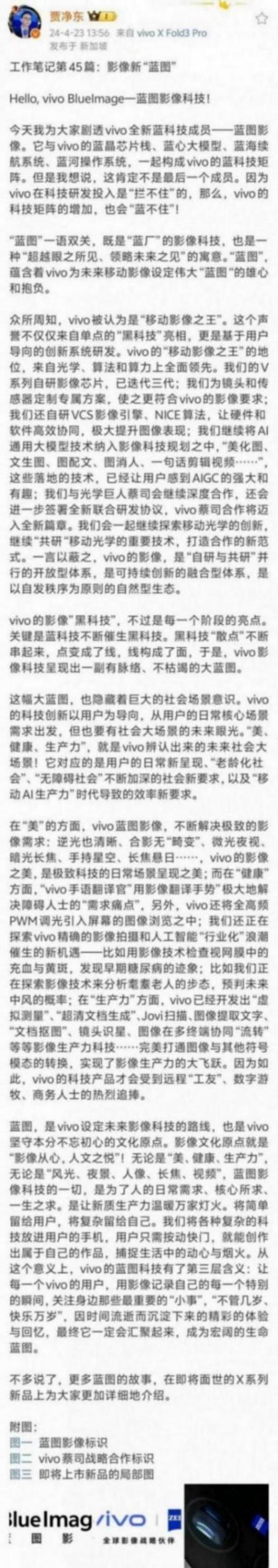 更重要的是蓝图影像是vivo众多“蓝”科技的新成员,与此前已经发布的蓝晶芯片栈、蓝心大模型、蓝海续航系统、蓝河操作系统,一起构成vivo的蓝科技矩阵。每一个以“蓝”开头命名的新技术都是vivo自研成果的表现。代表着vivo对于科技创新的追求,代表着vivo对于用户体验的关注度等等。