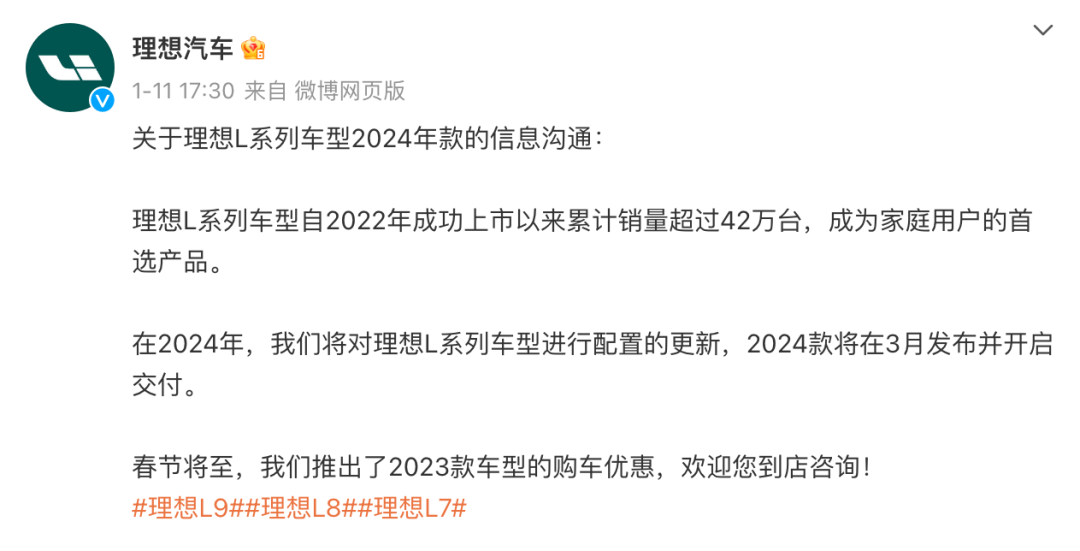 1月11月,理想汽车官方在微博宣布,“将对理想l系列车型进行配置的更新,2024款车型将在3月发布并开启交付。同时,春节将至,理想汽车推出2023款车型的优惠活动。”