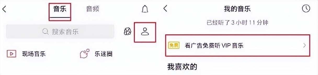 点击“音乐”j9com首页,右上角的人形图标,即可在“我的音乐”页面,看到置顶的“看广告免费听vip音乐”。