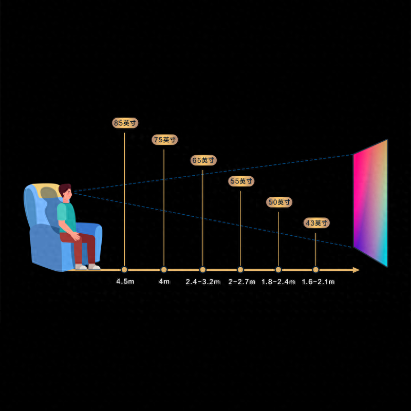 首先要选择合适尺寸的智能电视,现在的智能电视尺寸从43英寸到100英寸应有尽有,但是电视机和客厅之间,要恰如其分,不应选择过小或过大的尺寸,影响整体观感。所以,选择智能电视大小以及观看距离,参考下图。