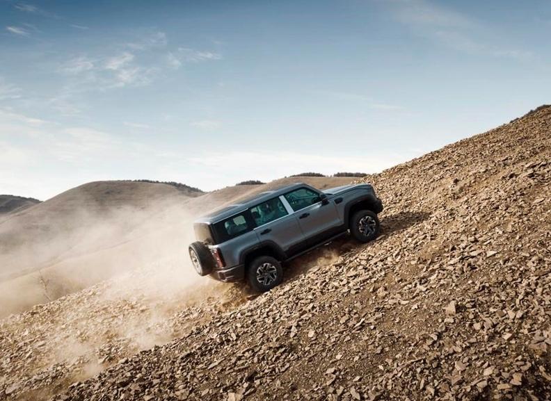 侧身整体轮廓方正硬朗,前后轮眉明显隆起,配合立体锋锐的腰线设计,力量感十足。采用全黑的门把手设计,d柱位置的饰板改为黑色。尾门采用分段式开启方式,配备全尺寸外挂式备胎,f样式的竖置尾灯辨识度较高。该车右侧前翼子板处设计了涉水喉的安装预留口,具备2.5顿的拖挂资质。