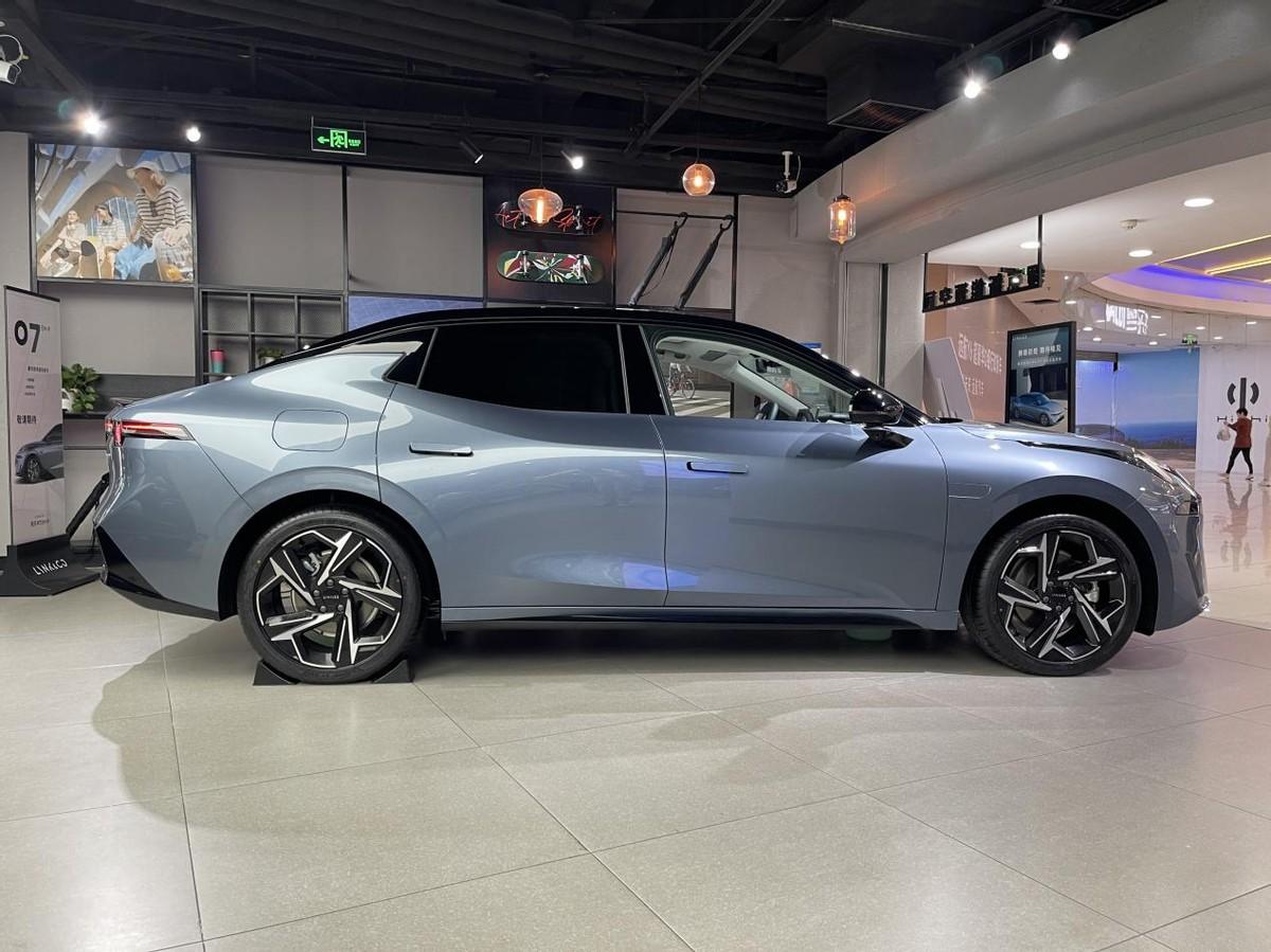 从侧面来看,领克07 em-p的设计也是非常运动的。首先它会采用高腰线的设计,整个侧面呈现出前低后高的车身姿态,俯冲式的样式也是增添了整台车运动的气息。另外,这台车也会加入黑色的元素,比如后视镜的外壳、车窗边框以及侧裙位置都会加入黑色的材质,这也进一步提升整车运动的气质。