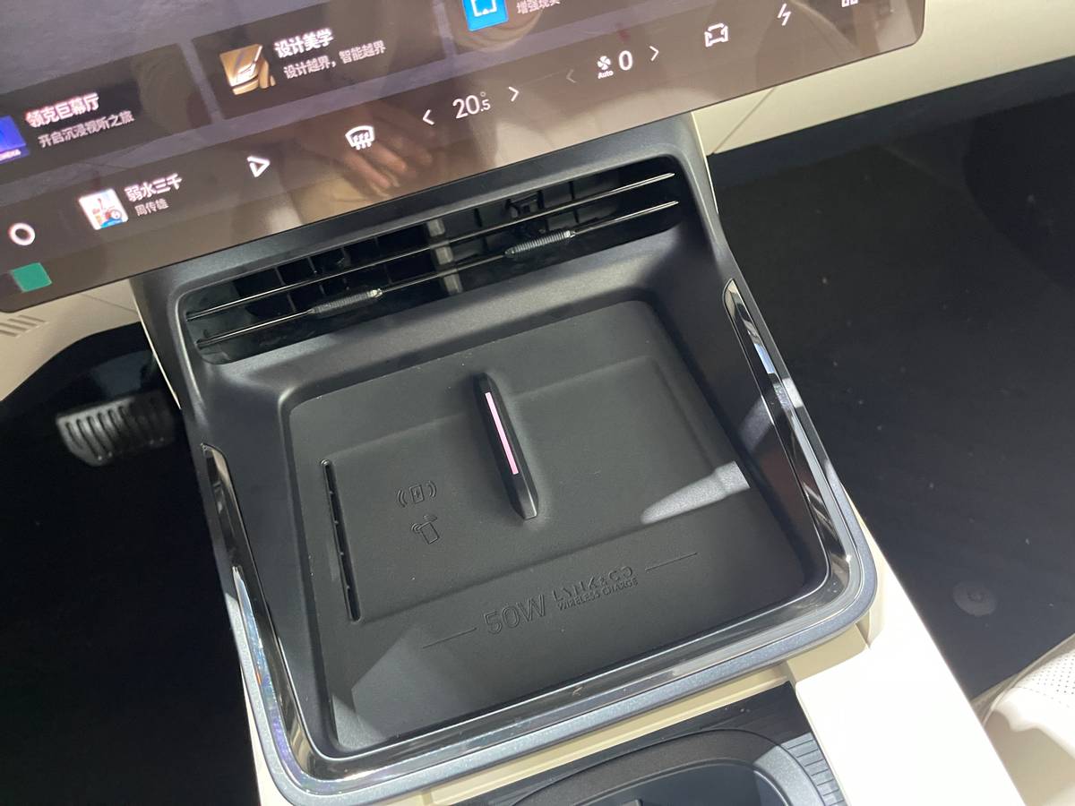 在中控屏幕的下方,它也会加入无线手机充电面板,它的功率可以达到50w。中央扶手区域的空间也是比较大的,放置4瓶水或6瓶水也是非常轻松。并且,其内部会有2个type-c的接口,其中一个接口的充电功率可以达到60w。