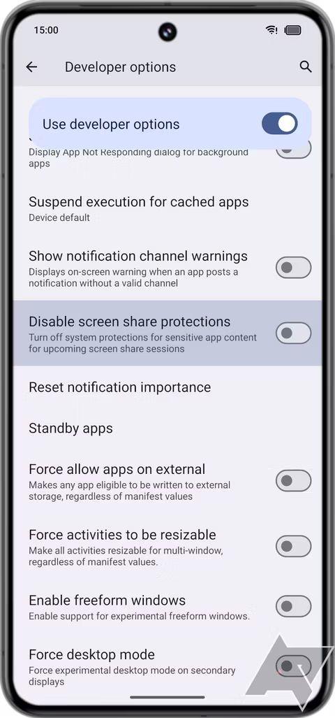 谷歌在近日发布的安卓 15 beta 1.1 更新的开发者选项中,引入了“disable screen share protections”(禁用屏幕共享保护)选项,可以在屏幕共享期间禁止运行某些系统应用以及相关通知。it之家附上截图如下:
