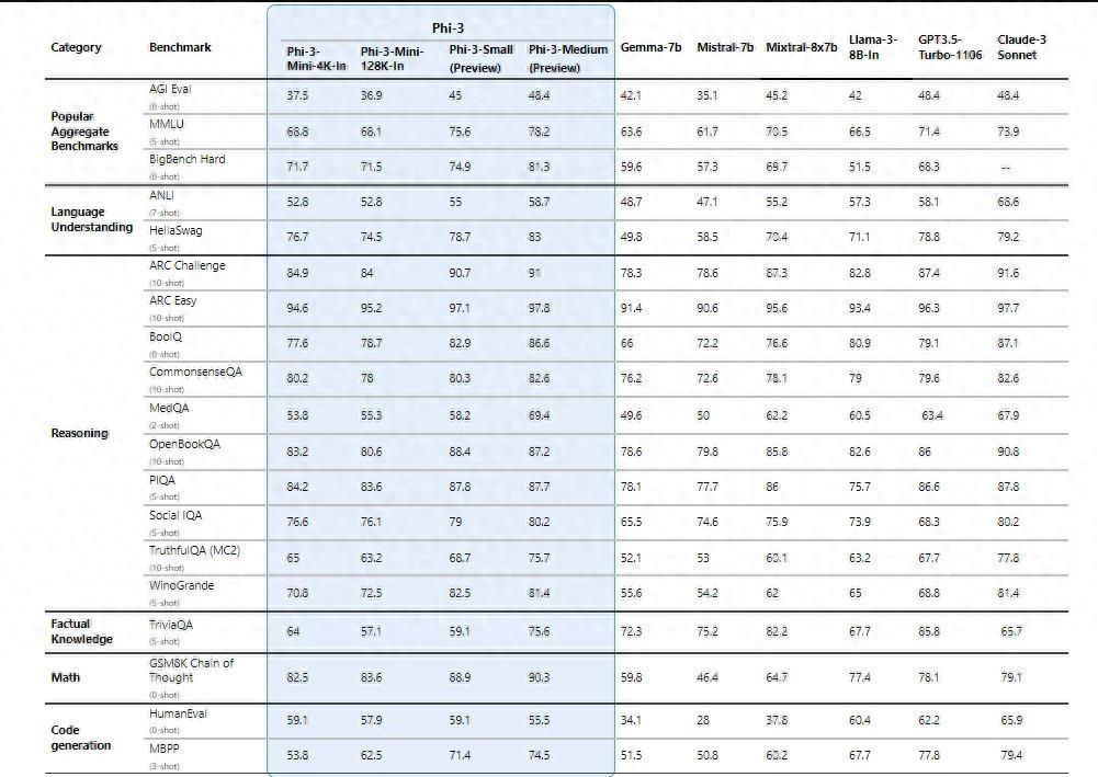 性能上,phi-3-mini在多项基准测试中超过了参数规模大一倍多的llama 3 8b(80亿参数),而phi-3-small和phi-3-medium超过了很多尺寸大得多的模型,如gpt-3.5 turbo,而后者的参数规模高达1750亿。