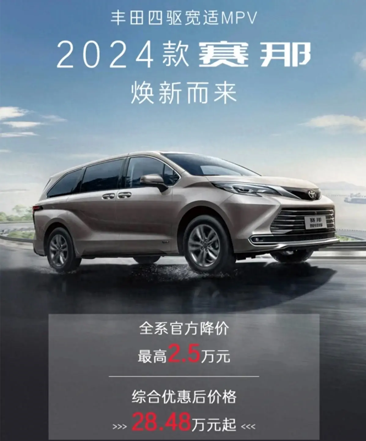 2024款广汽丰田赛那,4月23日正式上市,一共推出了9款新车型,全国统一售价区间在28.48-39.58万元之间。焕新而来的丰田赛那,相比老款来说,降价达到2.5万元。真是为用户所想。