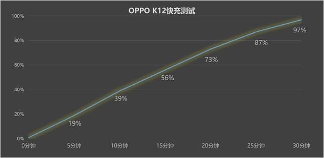 可以看到,oppo k12仅用5分钟就能给5500mah大电池充入20%左右电量,15分钟过半,30分钟左右充满,这个速度已经与高端旗舰所差无多,中端产品也能普及旗舰级别的充电速度。