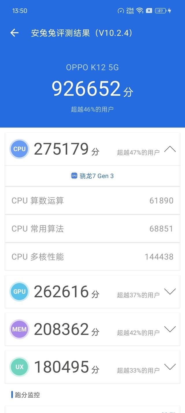 首先是跑分测试,oppo k12获得了安兔兔v10测试926652分的成绩,符合这款手机的定位。