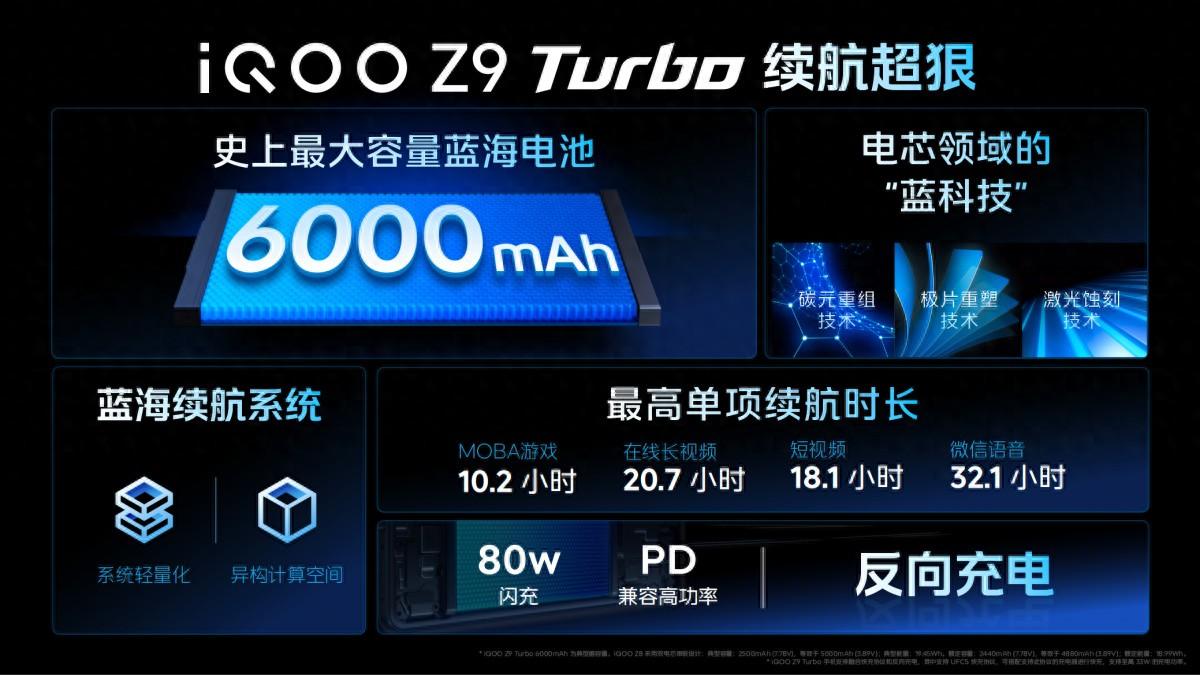 此次,iqoo z9全系配备 6000mah大电池。iqoo z9 turbo与iqoo z9采用蓝海电池技术,让两款手机快充、耐用和轻薄三者兼得。iqoo z9 turbo与iqoo z9支持80w 闪充,7.5w 有线反向充电。
