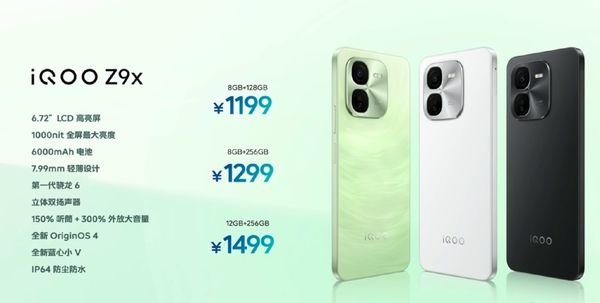 第三款机型为iqoo z9x,这款产品搭载了6.72英寸的lcd屏幕,配备6000mah大电池和骁龙6 gen 1移动平台,提供三种存储版本,其中8gb+128gb售价1149元,8gb+256gb售价1249元,12gb+256gb售价1449元。