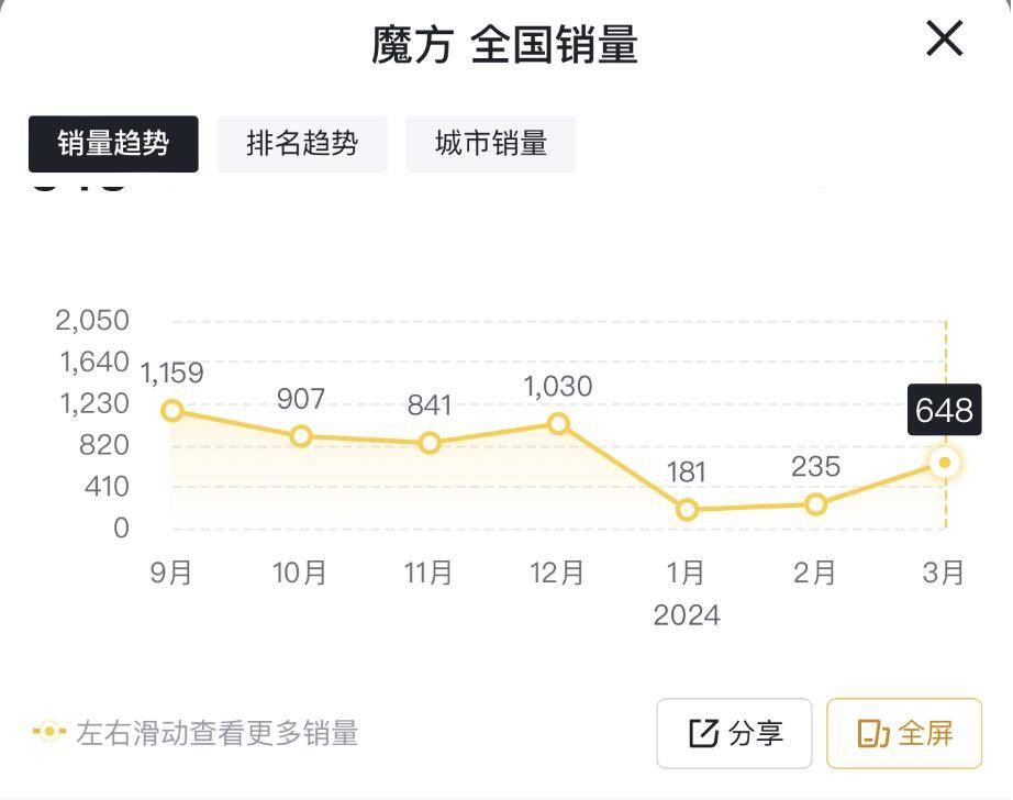 另一方面、市场竞争激烈,也让魔方的销量遭受了一定的冲击。众所周知,进入2024年之后,国内汽车市场的竞争更加激烈。