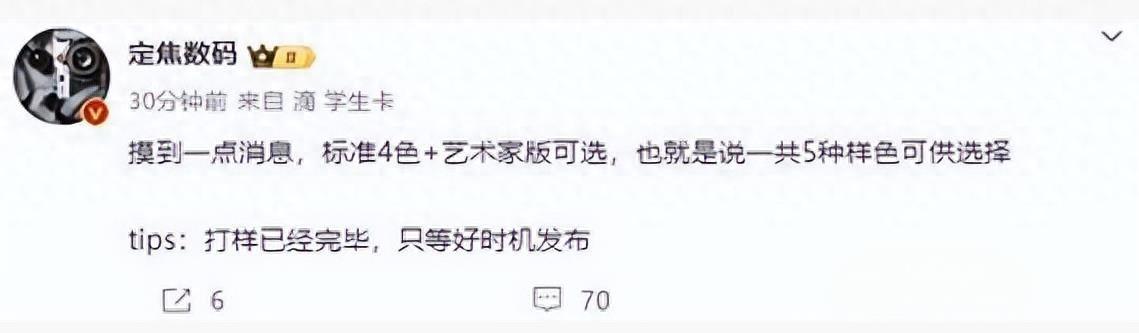 有博主爆料,华为p70系列将提供不同颜色的选择,包括标准4色和艺术家版,总计5种样色。这对于讲究外观的朋友来说,又有多种选择了。这款手机的外观设计相当独特,采用了三角形摄像头模组,给人一种极强的辨识度,相比之前的设计有了很大的改变。