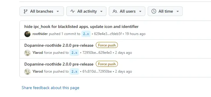 目前 roothide 大神还未发推告知,消息来源于 github 上公开得知,从项目活动可见,大神将 dopamine 越狱修改成 roothide 越狱,并命名为 dopamine-roothide 越狱,版本号是 2.x 版本。