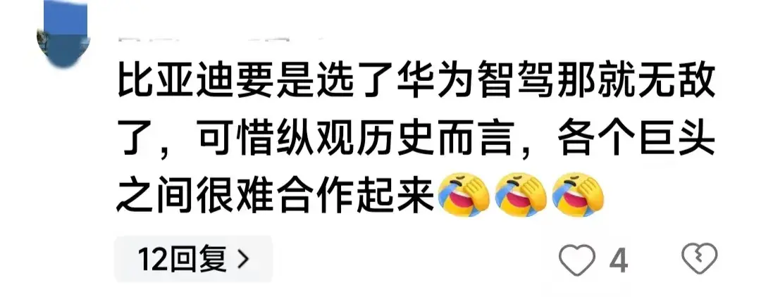 网友三,如果比亚迪能选择华为智驾那就无敌了,可惜纵观历史,巨头之间很难合作得起来。