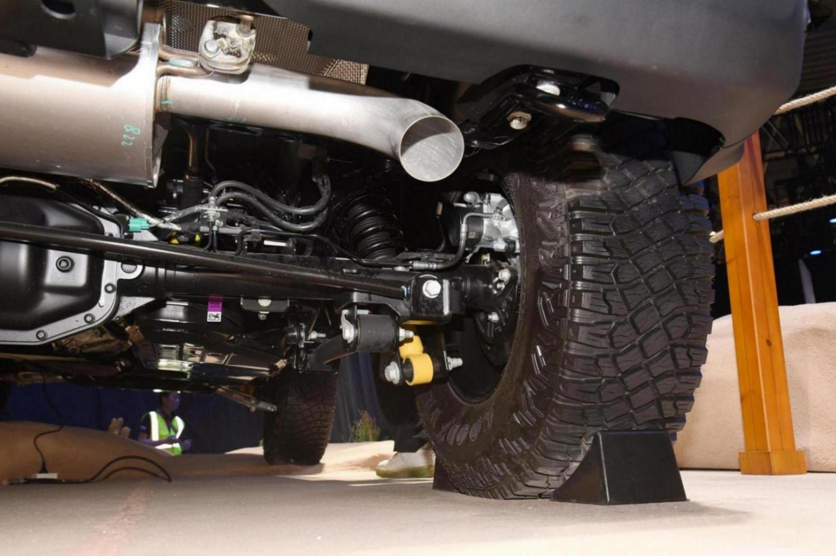 大脚版的接近角能达到夸张的45度,离去角37度,通过角26度,最小离地间隙273mm,最大涉水深度850mm,选装涉水喉的情况下能够达到925mm的最大越野深度。