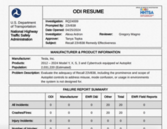 据悉,监管机构调查的主要原因是:在车辆被召回并进行了软件更新后又发生了多起碰撞事故,并且该管理局初步的测试结果也引发了担忧。