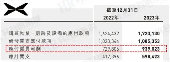 2023年底,小鹏“应付雇员薪酬”9.39亿,年底员工1.3万人,即人均年终奖6.9万(含12月工资),2022年是4.6万。
