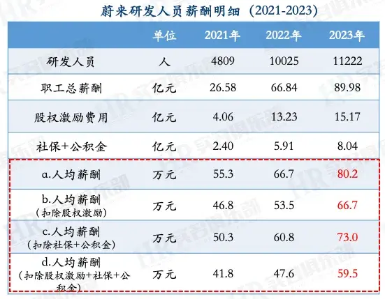 以2023年蔚来研发薪酬为例,主要有四种统计口径: