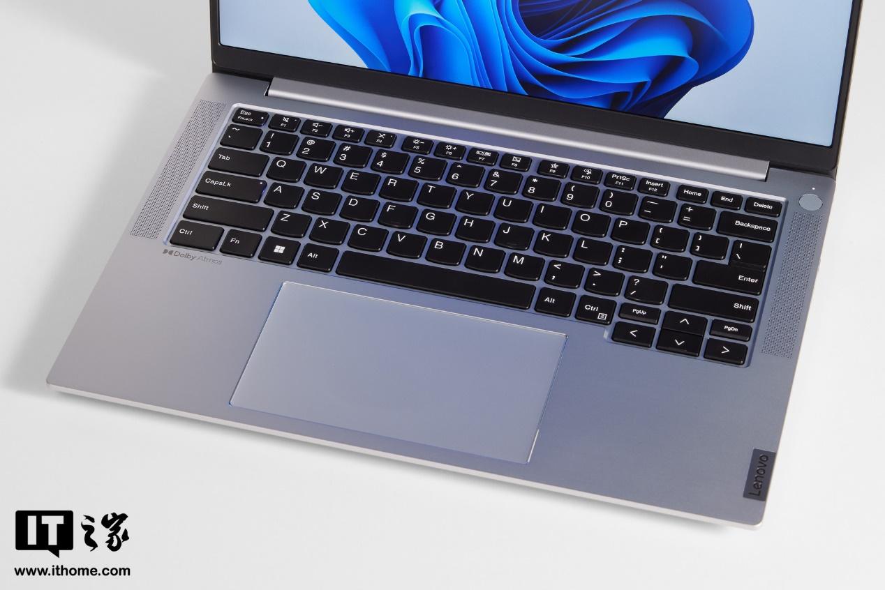 c 面标志性的联想键盘布局,弧形微笑键帽,下凹独立方向键,充满了浓浓的“联想味”。键盘右上角自带指纹识别和状态指示灯的独立电源键,还有超大面积的触控板都是熟悉味道。