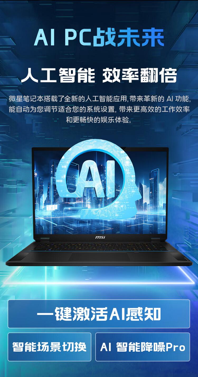 绝影 18 与其他 2024 款微星笔记本相同,搭载全新的人工智能应用,如一键激活 ai 感知、智能场景切换、ai 智能降噪 pro 等。