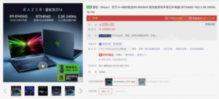 雷蛇灵刃14:amd r9 8945hs处理器,rtx4060独显,16gb内存 1tb ssd,2.5k 240hz 电竞屏,68.1wh电池,17.99mm 1.84kg机身,到手价20999。