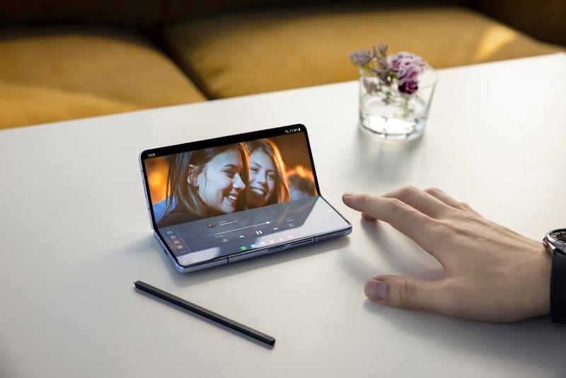 不仅如此,三星galaxy z fold5还拥有更为完善的立式交互模式,让用户获得类似笔记电脑的高能交互体验。例如,用户出差途中需要参加视频会议,可以将三星galaxy z fold5放在高铁的小桌板上,上半屏幕进行视频,下班屏幕则可以记录会议纪要、浏览会议资料等。在观看视频时,三星galaxy z fold5升级的立式交互触控功能大幅优化了操作层级,让高效的沉浸体验一触即达。例如,用户观看学习资料、设计演示视频等内容时,可以在下半屏通过触控来实现暂停/播放、快进/快退、音量增大/减小等操作,在提升效率的同时,还能让用户更加专注。