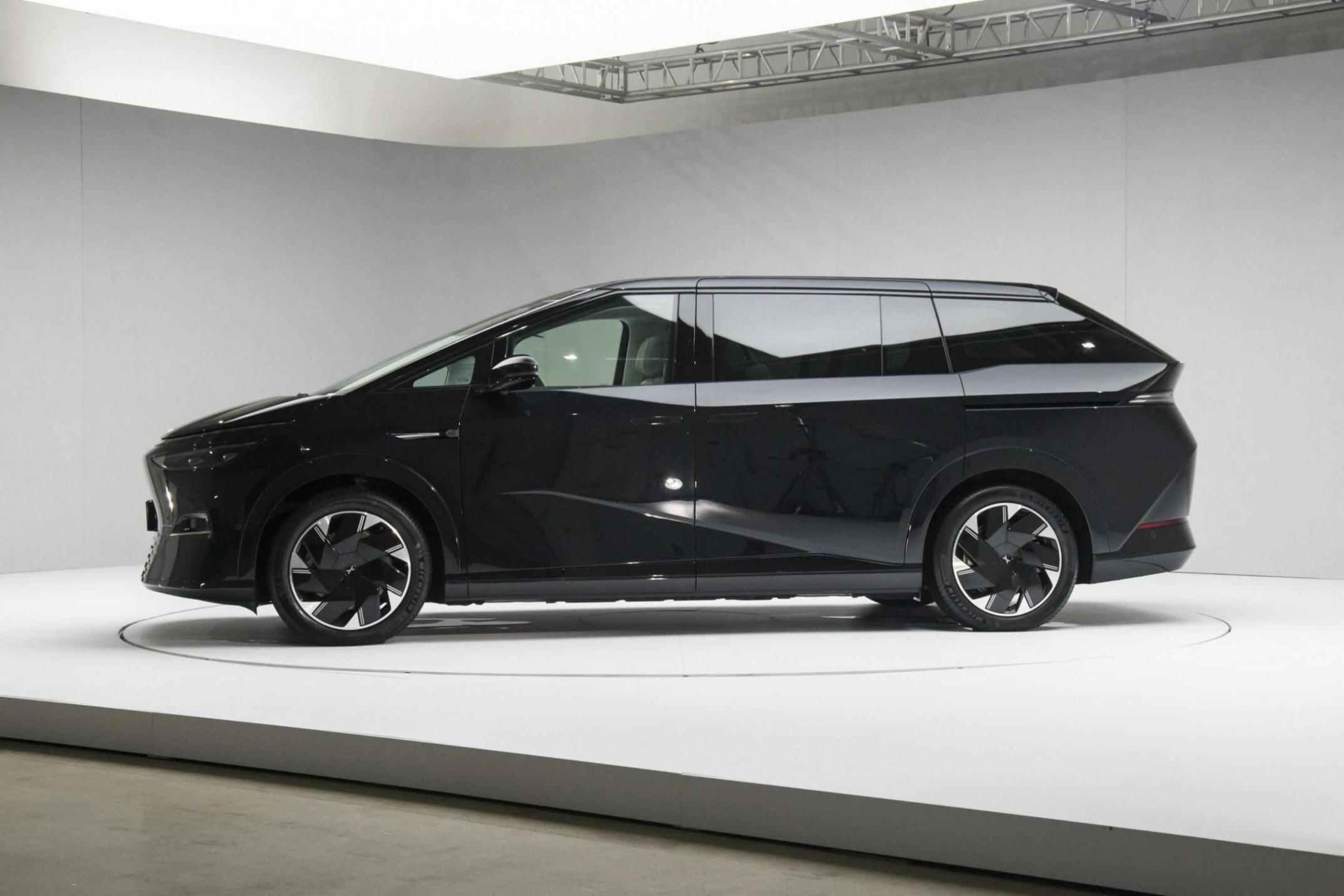 从侧面看,侧面造型也很有新意,对称倾斜的a柱与d柱打破了mpv常见的方盒子造型,也能大幅度降低风阻,加上纯平的侧窗、隐藏门把手等细节,让整车看起来非常流畅。车身尺寸长宽高分别为5293x1988x1785mm,轴距为3160mm。前后轮胎规格尺寸为235/55 r19。