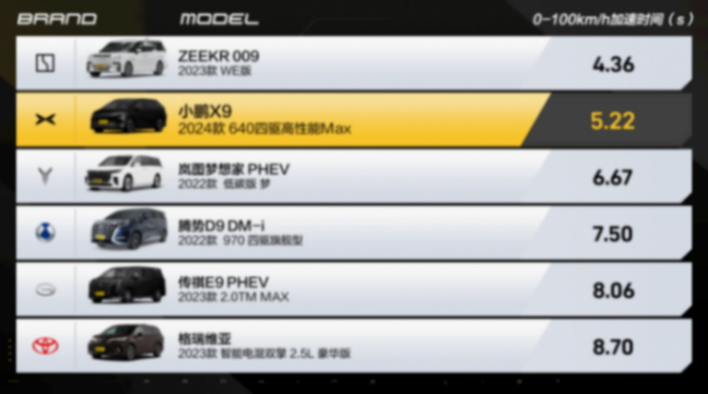 懂车帝实测结果显示,小鹏 x9 的 0-100km/h 加速时间为 5.22 秒,400 米加速时间为 13.37 秒。作为一款纯电动 mpv,这样的加速表现已经非常出色了。在实际驾驶中,小鹏 x9 的动力响应非常迅速,加速过程中也非常平顺,不会有明显的顿挫感。此外,小鹏 x9 的动力储备也非常充足,在高速行驶中也能轻松完成超车动作。