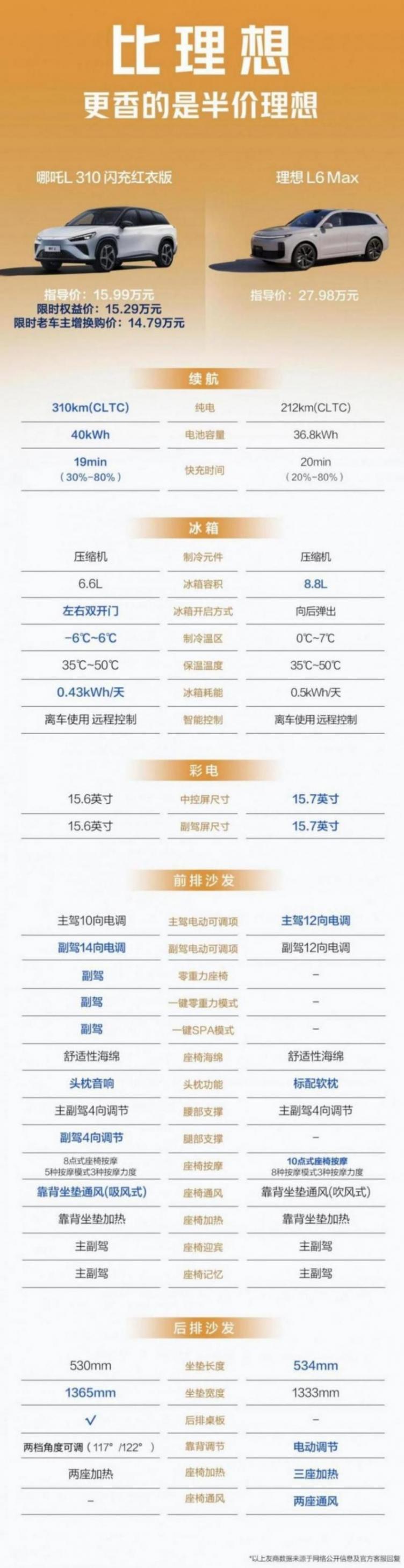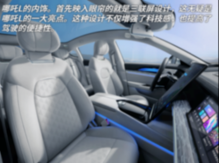 步入车内,内饰设计呈现出沉稳而不失现代感的格调,360度环抱式座舱布局带来宽敞舒适的空间感受。中控台遵循极简主义理念,上下两部分划分清晰,隐藏式空调出风口设计巧妙,视觉效果舒展而协调。多功能三幅式方向盘集成换挡功能,操作便捷;中控屏采用双15.6英寸屏幕支持语音对话、人脸识别、屏幕触控等多种交互方式。更是配齐了“冰箱彩电大沙发”三大件。更而售价24.98万元的理想l6也是双15.7寸的屏幕,但相比哪吒l的三大件,理想l6明显不如哪吒l有优势。
