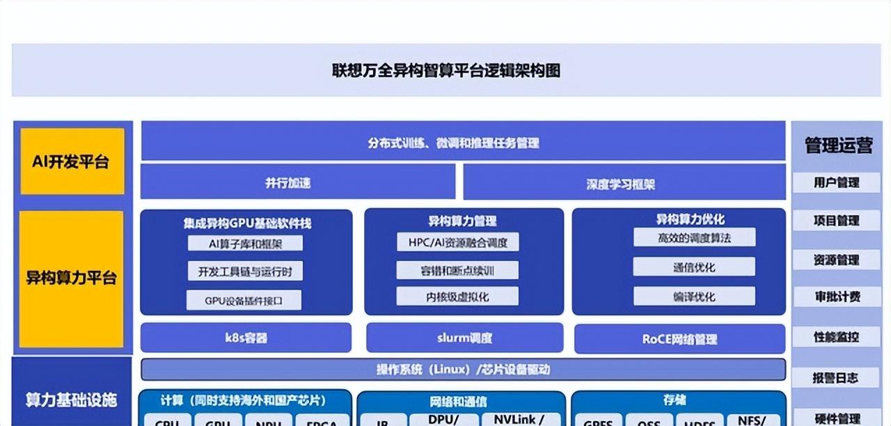 所谓一横,是指异构智算平台。这款平台融合了联想多年来在通用计算、科学计算、ai计算领域的技术积淀,可统一调度和管理cpu、gpu、dpu等异构算力。通过智能算法,异构智算平台能精准匹配场景需求与算力资源,最大化算力利用率。