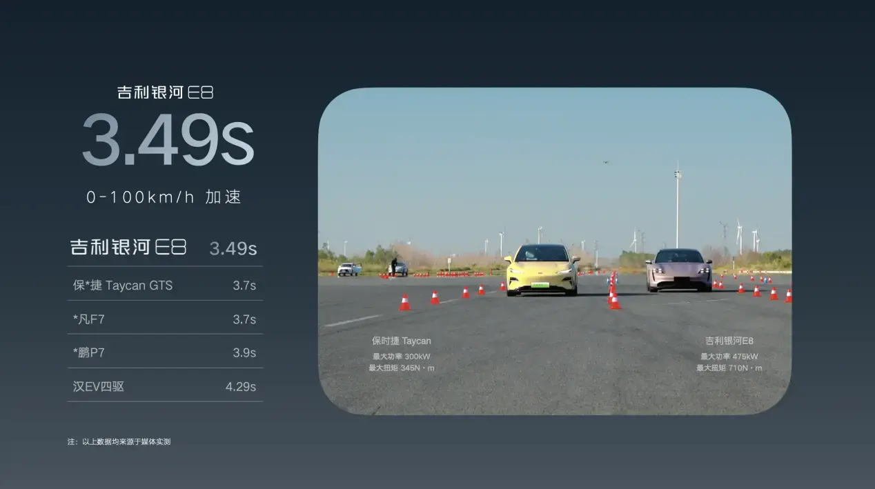 其次则是动力,银河e8提供后驱版和四驱版可选,其中后驱版车型采用400v架构,使用单电机,电机最大功率为200kw,最大扭矩343牛·米,在它的加持下,后驱版的e8能做到5.95秒破百,最高车速190km/h,数据看着好像不怎么出色,但在同价位车型中已经是顶流水平。